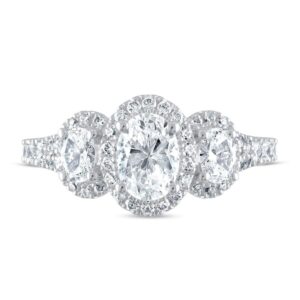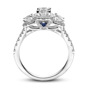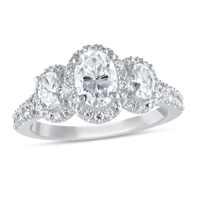 This spectacular three-stone engagement ring features dazzling oval diamonds haloed by round diamonds. Even more round diamonds add brilliance to the band, bringing the total diamond weight to 1 3/4 carats. Princess-cut sapphires, the signature of the collection and a symbol of faithfulness and everlasting love, are set into the ring bezel. The 14K white gold ring is a brilliant beginning to your romantic love story.
