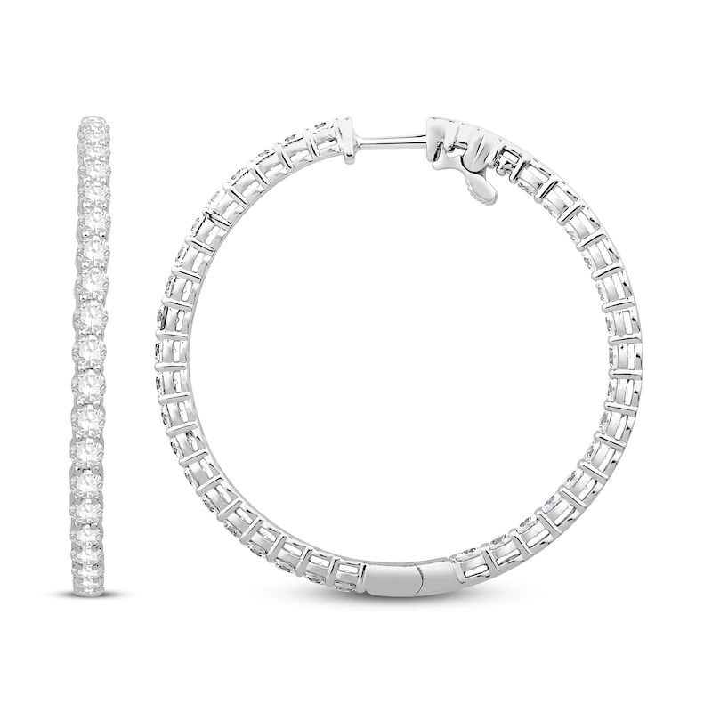 Brilliant round diamonds line the fronts and the inside of the backs to create a unique look in these exquisite women's hoop earrings. Fashioned in 14K white gold, the total diamond weight is an impressive 6 carats and the earrings secure in place with snap-lock backs.