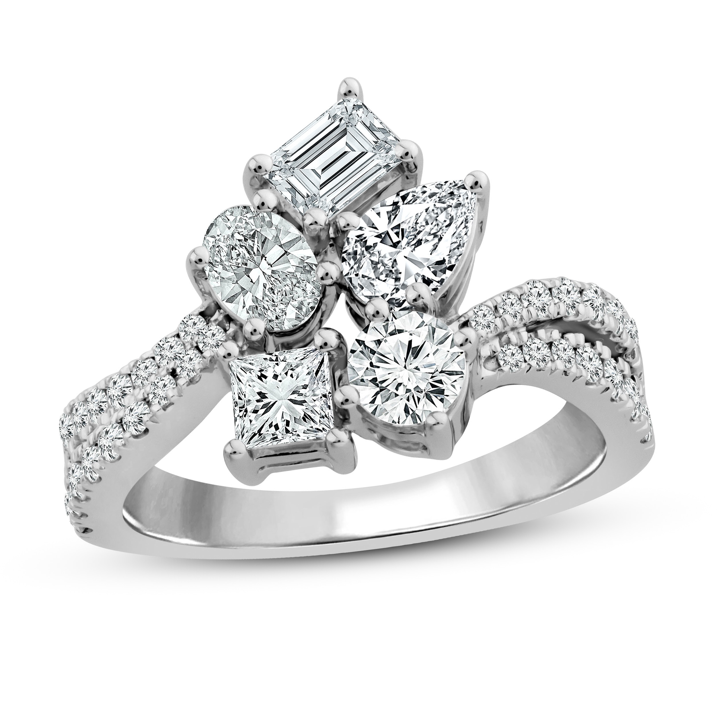 This enchanting diamond ring collection features five distinctively-shaped diamonds, symbolic of everything she means to you. Each diamond shape has a different meaning, from integrity and wisdom, to confidence, totality, and elegance. The beautiful 10K white gold ring features an oval-cut, emerald-cut, pear-shaped, round-cut, and princess-cut diamond at the center, while ribbons of brilliant round-cut diamonds flow outward. The gorgeous ring has a total diamond weight of 2 carats.